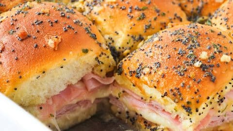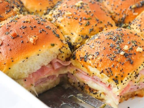 These insanely delicious mini ham and cheese sammies deliver a blast of sweet, salty, buttery, cheesy, meaty, and savory flavor in every single ooey-gooey bite. Two sliders per serving.