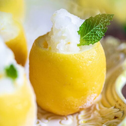 Scoop frozen sorbet into frozen lemon cups and freeze again for another hour. Remove from freezer just before serving.