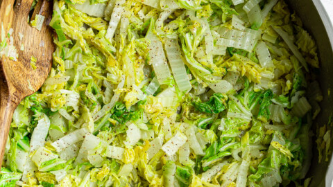 In a large skillet over medium heat, add in the butter and olive oil. Once hot, add in the garlic and sauté for 3 minutes. Add in the cabbage and season with salt and pepper. Sauté for 10-12 minutes, stirring a few times, until it’s tender.