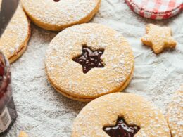 Once cool, spoon about 1-2 tablespoons of jam onto each solid cookie. Gently press a cut-out cookie on top to make a sandwich. If the jam squishes out a little, congratulations – that’s the charm of a Linzer.