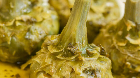 Uncover the pot and allow the artichokes to cool before serving, moistened with a bit of the liquid.