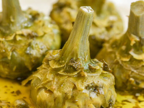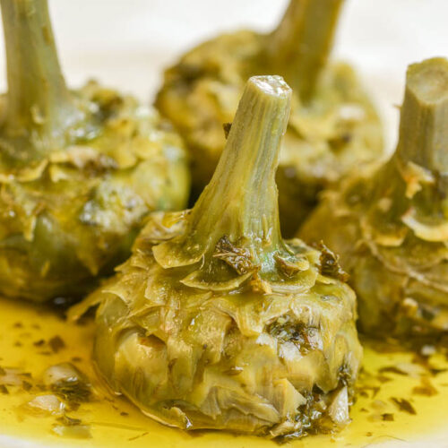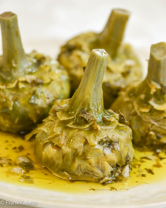 Pour a generous amount of olive oil over the artichokes, then pour enough water into the pot to come halfway up the artichokes (not counting their stems).
