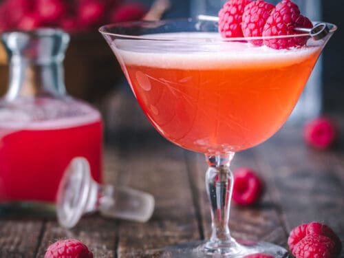 Strain the drink into a coupe glass. Garnish with fresh raspberries or a lemon twist.
