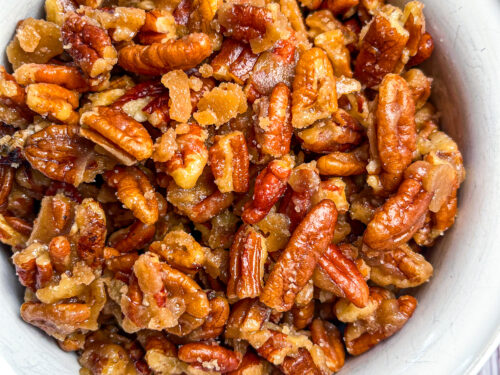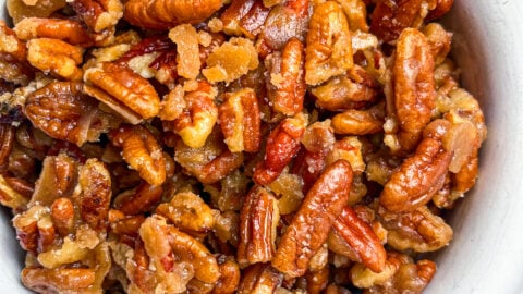 Buttery, sweet and a touch salty, these candied pecans are addictively delicious and they take only 20 minutes to make! Complete a charcuterie board, toss into a salad, or sprinkle over ice cream, homemade candied pecans should be in your pantry year round!