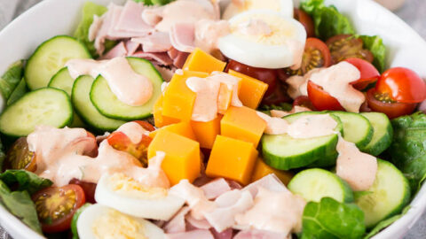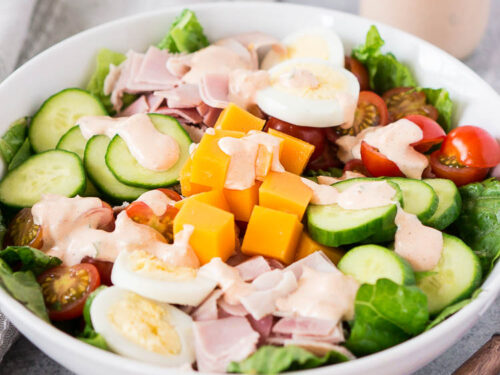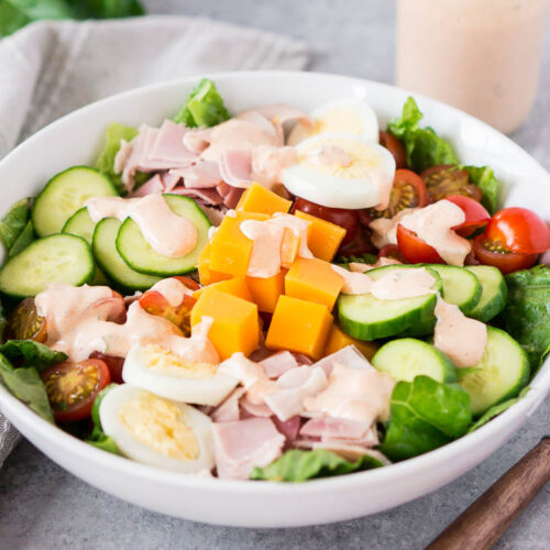 This simple chopped chef salad is perfect for a light lunch and so quick and easy to make. Dressed with a tangy Thousand Island dressing, it's fresh, healthy and super delicious.