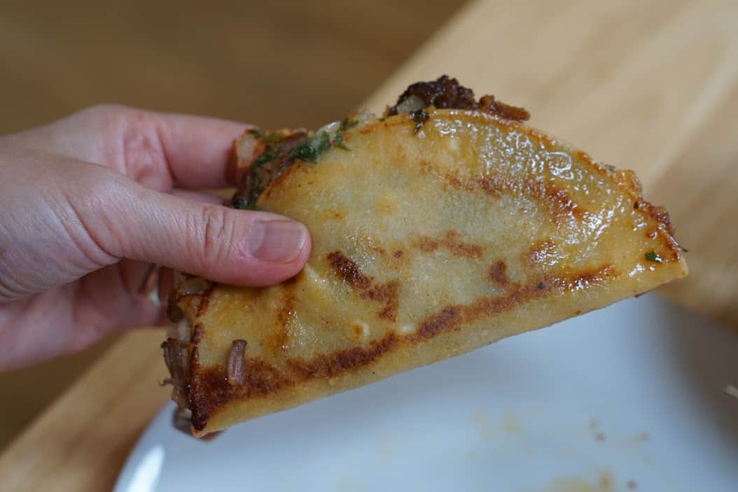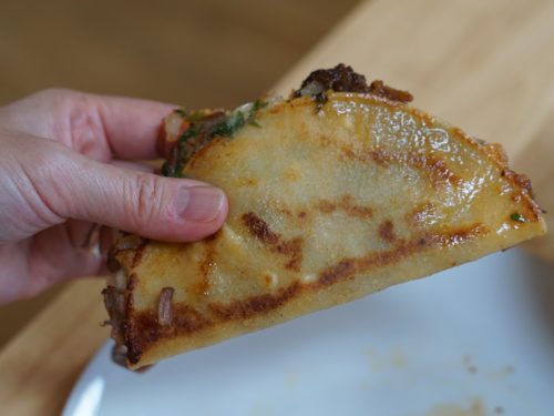 - Add beef, Monterrey Jack cheese, cilantro, and chopped onions, then fold tortilla over.