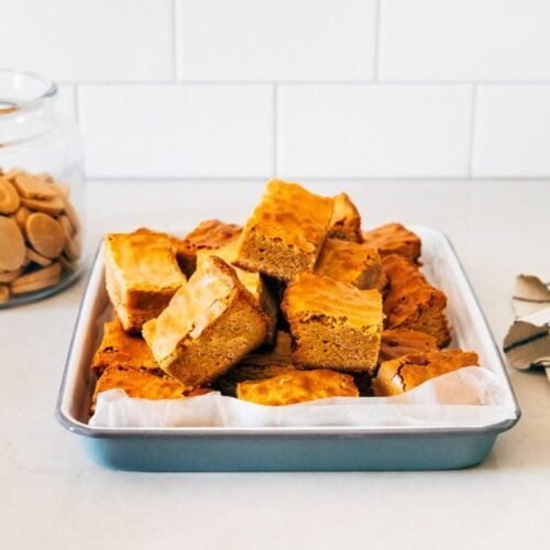 Once the blondies are at room temperature, tug the foil loose and lift the blondies from the pan. Cut into twenty four 2 1/4-inch squares. Store in an airtight container with a sheet of wax paper between each layer for up to 1 week at room temperature.
