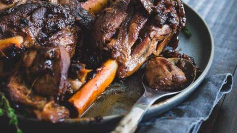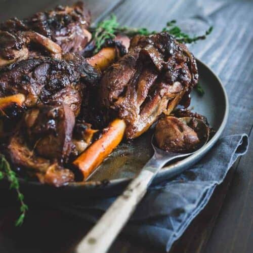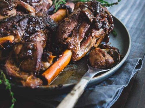 These apple cider braised lamb shanks are fall off the bone tender with caramelized, crispy bits and sweet apple and onion slices.