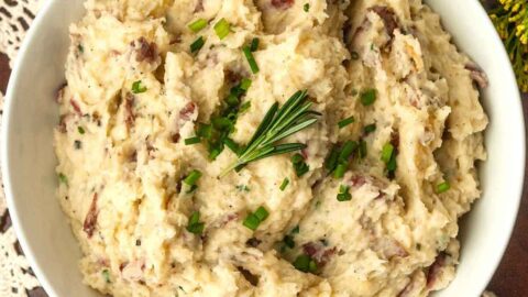 These easy, creamy rosemary and chive mashed potatoes also include roasted garlic, parmesan and plenty of butter! With only 7 main ingredients, your guests will be delighted with its rustic texture, heavenly aroma and creamy, herbal flavor.