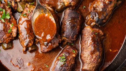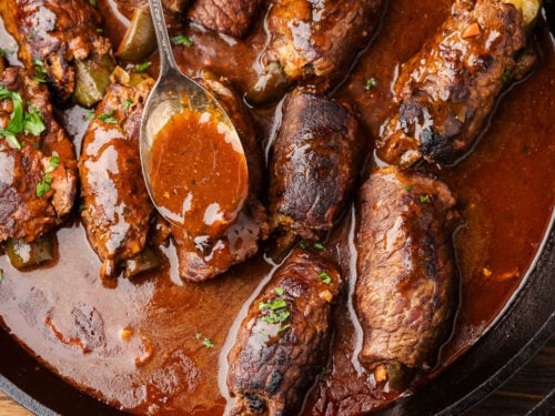 Beef Rouladen is a traditional German dish of thinly sliced beef that's rolled with a delicious filling of bacon, mustard, pickles, and vegetables, then braised in a rich brown gravy until tender. Perfect for special occasions, including Oktoberfest celebrations!
